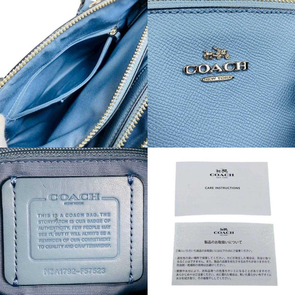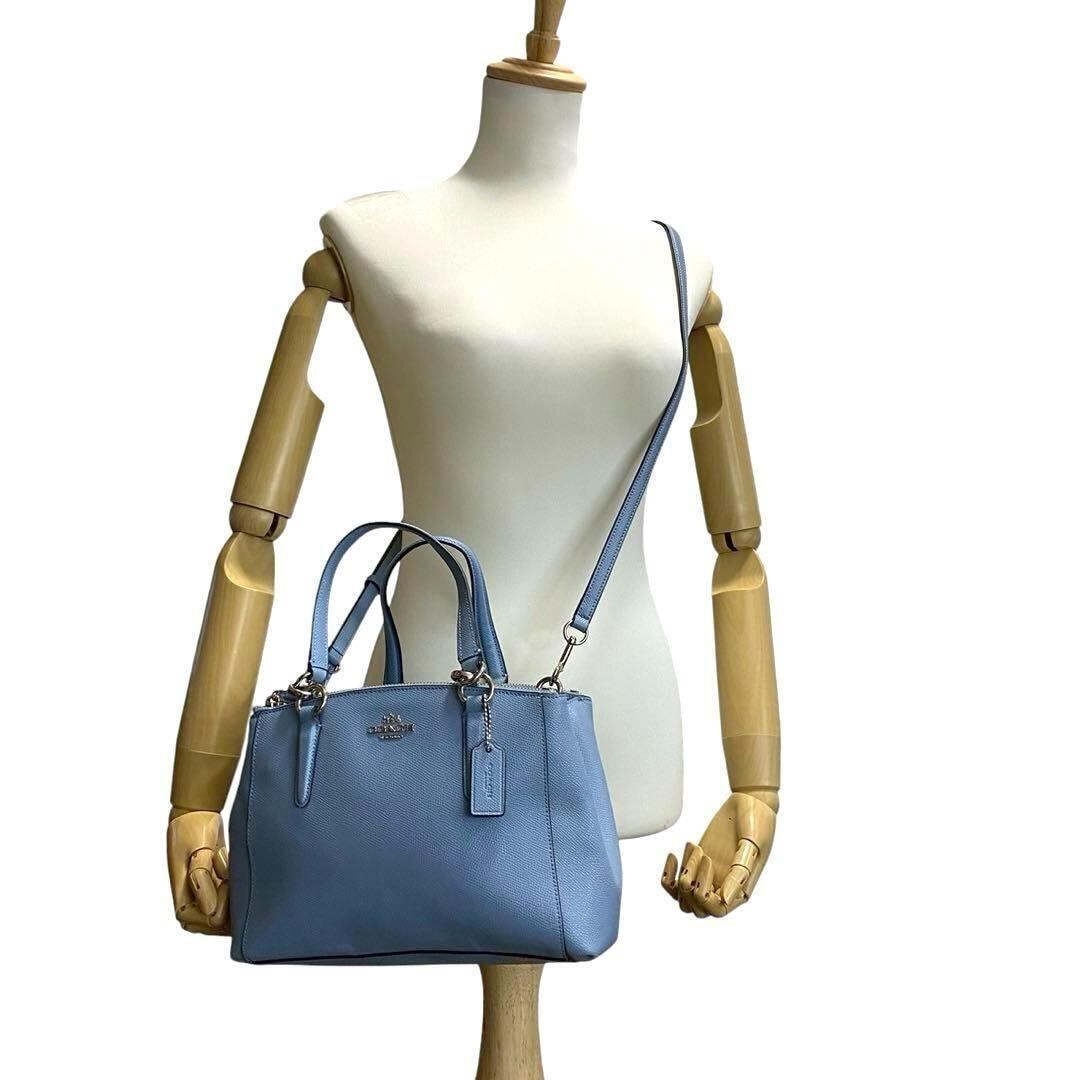 【B2789】 【美品】 COACH コーチ ショルダーバッグ 2way セージキャリーオール ハンドバッグ 斜め掛け ライトブルー オールレザー F57523